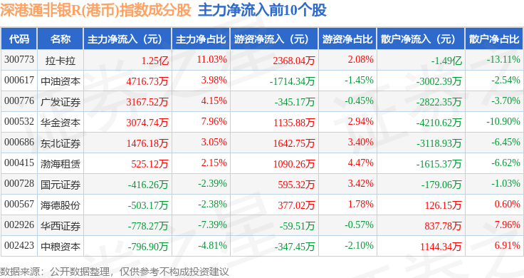 资金流向方面,深港通非银R(港币)(483054)指数成份股当日主力资金净流出合计4.67亿元,游资资金净流入合计2.98亿元,散户资金净流入合计1.69亿元。成份股资金流向详情见下表:
