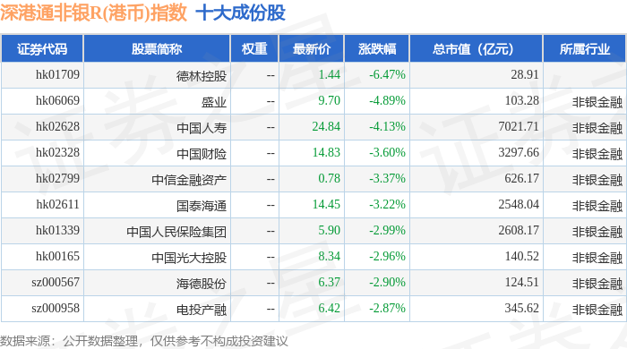 深港通非银R(港币)(483054)指数十大成份股详情如下: