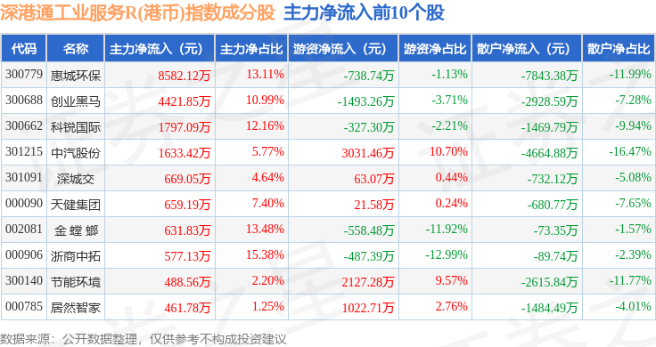 资金流向方面,深港通工业服务R(港币)(483056)指数成份股当日主力资金净流出合计10.23亿元,游资资金净流入合计3543.87万元,散户资金净流入合计9.88亿元。成份股资金流向详情见下表:
