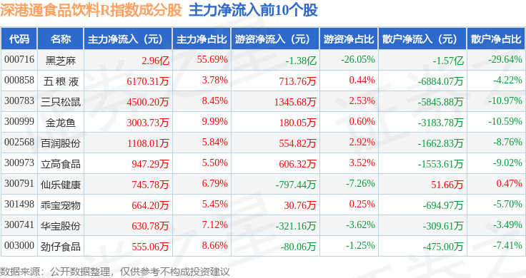 资金流向方面,深港通食品饮料R(483065)指数成份股当日主力资金净流入合计1.25亿元,游资资金净流出合计1.31亿元,散户资金净流入合计647.23万元。成份股资金流向详情见下表: