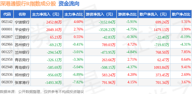 资金流向方面,深港通银行R(483081)指数成份股当日主力资金净流入合计841.58万元,游资资金净流出合计5277.31万元,散户资金净流入合计4435.73万元。成份股资金流向详情见下表: