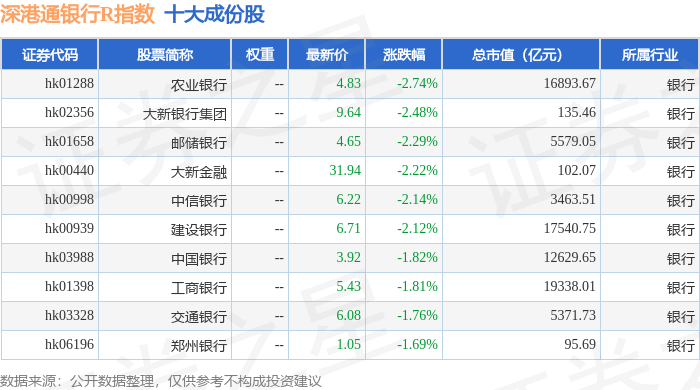 证券之星消息,12月16日,深港通银行R(483081)指数报收于12278.56点,跌1.05%,成交82.48亿元,换手率0.18%。当日该指数成份股中,上涨的有1家,渣打集团以1.1%的涨幅领涨,下跌的有27家,农业银行以2.74%的跌幅领跌。