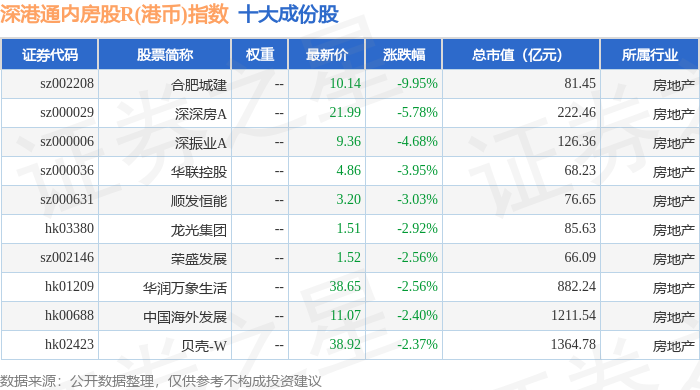 深港通内房股R(港币)(483084)指数十大成份股详情如下: