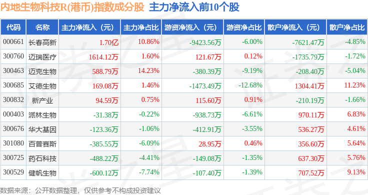 资金流向方面,内地生物科技R(港币)(483102)指数成份股当日主力资金净流出合计6.19亿元,游资资金净流入合计4868.27万元,散户资金净流入合计5.71亿元。成份股资金流向详情见下表: