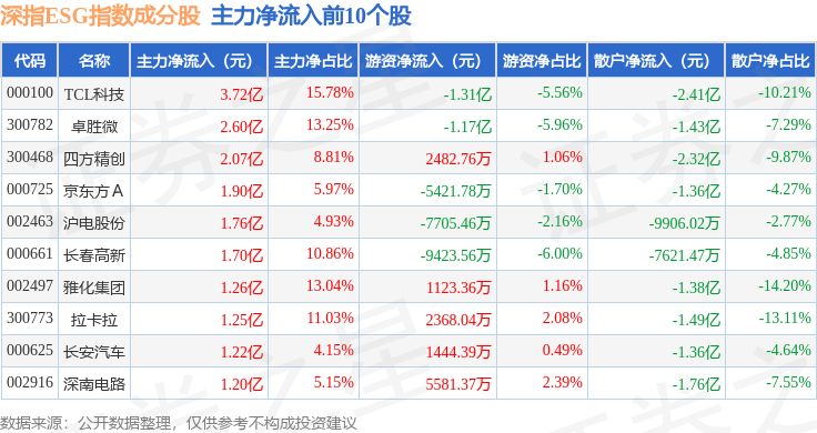资金流向方面,深指ESG(970026)指数成份股当日主力资金净流出合计203.59亿元,游资资金净流入合计32.96亿元,散户资金净流入合计170.63亿元。成份股资金流向详情见下表: