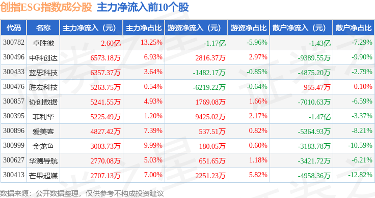 资金流向方面,创指ESG(970028)指数成份股当日主力资金净流出合计87.97亿元,游资资金净流入合计19.97亿元,散户资金净流入合计68.0亿元。成份股资金流向详情见下表: