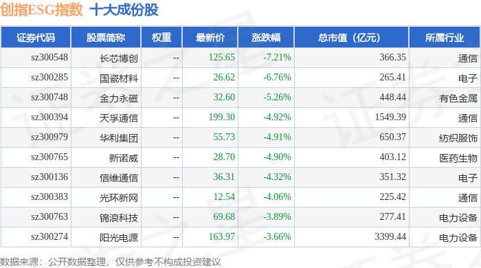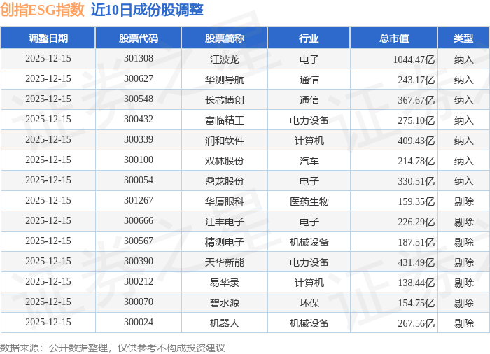 近10日内创指ESG(970028)指数成份股做了调整,新纳入了7只股票,剔除了7只股票。