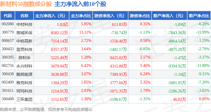 资金流向方面,新材料50(970042)指数成份股当日主力资金净流出合计30.39亿元,游资资金净流出合计6554.56万元,散户资金净流入合计31.05亿元。成份股资金流向详情见下表: