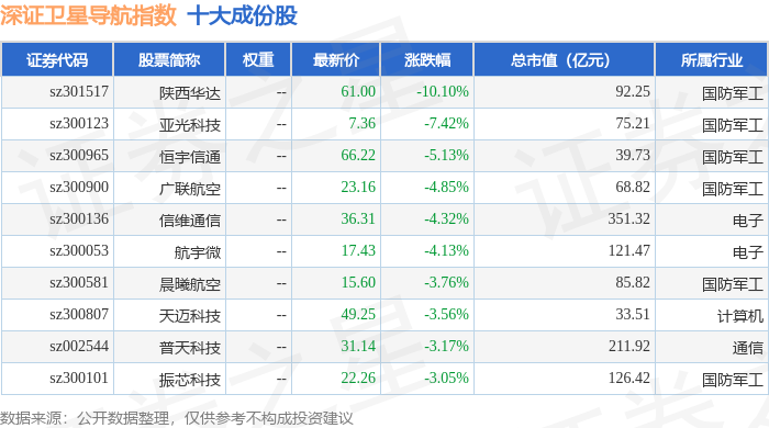 证券之星消息,12月16日,深证卫星导航(970050)指数报收于3633.15点,涨0.13%,成交554.8亿元,换手率8.81%。当日该指数成份股中,上涨的有15家,天银机电以10.1%的涨幅领涨,下跌的有25家,陕西华达以10.1%的跌幅领跌。