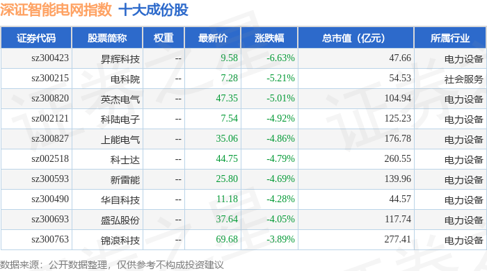 证券之星消息,12月16日,深证智能电网(970054)指数报收于3769.95点,跌2.81%,成交289.54亿元,换手率3.12%。当日该指数成份股中,上涨的有3家,高澜股份以1.05%的涨幅领涨,下跌的有47家,昇辉科技以6.63%的跌幅领跌。