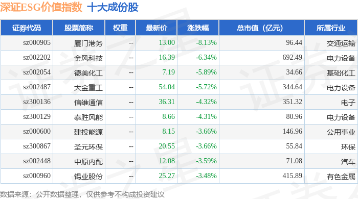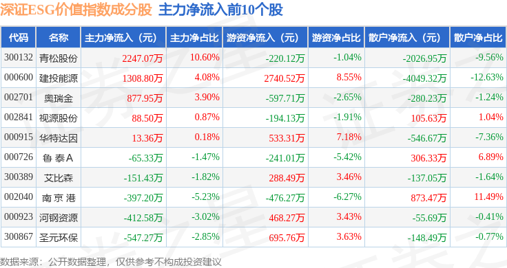 资金流向方面,深证ESG价值(970061)指数成份股当日主力资金净流出合计31.59亿元,游资资金净流入合计880.02万元,散户资金净流入合计31.51亿元。成份股资金流向详情见下表:
