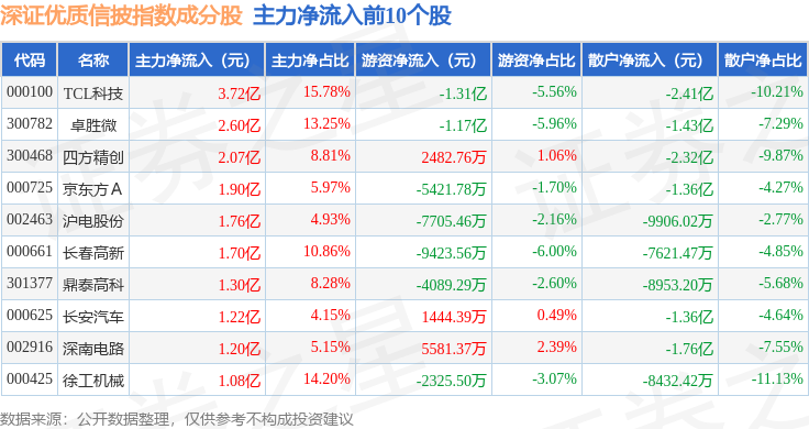 资金流向方面,深证优质信披(970065)指数成份股当日主力资金净流出合计188.84亿元,游资资金净流入合计34.74亿元,散户资金净流入合计154.1亿元。成份股资金流向详情见下表: