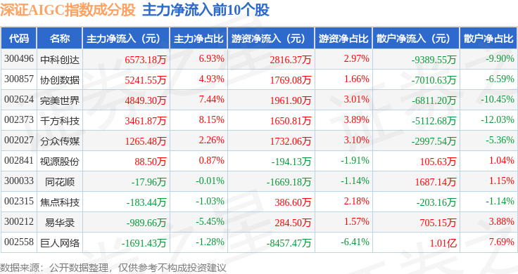 资金流向方面,深证AIGC(970075)指数成份股当日主力资金净流出合计20.82亿元,游资资金净流入合计5.28亿元,散户资金净流入合计15.54亿元。成份股资金流向详情见下表:
