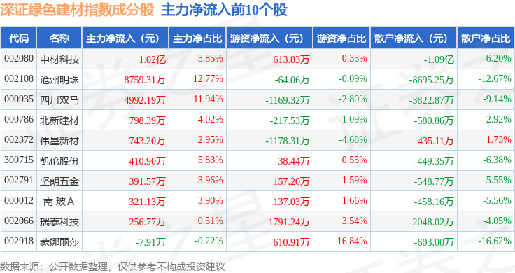 资金流向方面,深证绿色建材(970077)指数成份股当日主力资金净流入合计2666.81万元,游资资金净流入合计3983.14万元,散户资金净流出合计6649.95万元。成份股资金流向详情见下表: