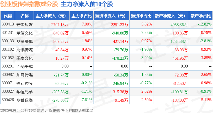 资金流向方面,创业板传媒(970084)指数成份股当日主力资金净流出合计10.77亿元,游资资金净流入合计7922.82万元,散户资金净流入合计9.98亿元。成份股资金流向详情见下表: