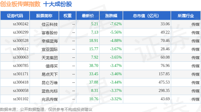 证券之星消息,12月16日,创业板传媒(970084)指数报收于1226.85点,跌2.54%,成交120.45亿元,换手率3.18%。当日该指数成份股中,上涨的有1家,芒果超媒以0.56%的涨幅领涨,下跌的有39家,佳云科技以7.62%的跌幅领跌。