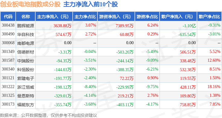 资金流向方面,创业板电池(970081)指数成份股当日主力资金净流出合计43.72亿元,游资资金净流入合计2.3亿元,散户资金净流入合计41.42亿元。成份股资金流向详情见下表: