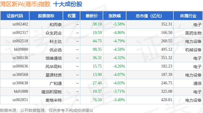 湾区新兴(港币)(980008)指数十大成份股详情如下: