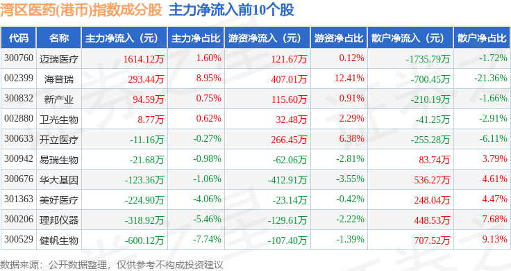 资金流向方面,湾区医药(港币)(980014)指数成份股当日主力资金净流出合计5.34亿元,游资资金净流入合计2987.8万元,散户资金净流入合计5.04亿元。成份股资金流向详情见下表: