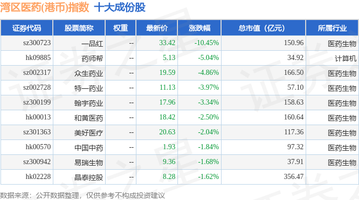 湾区医药(港币)(980014)指数十大成份股详情如下:
