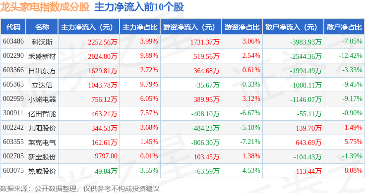 资金流向方面,龙头家电(980028)指数成份股当日主力资金净流出合计3.77亿元,游资资金净流入合计2.32亿元,散户资金净流入合计1.45亿元。成份股资金流向详情见下表: