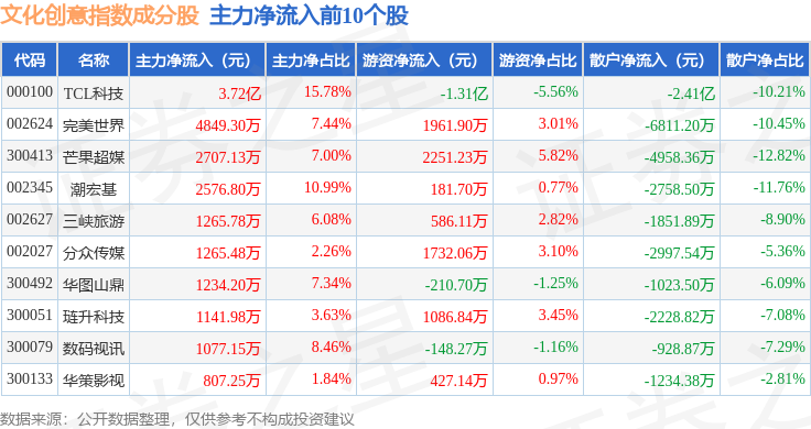 资金流向方面,文化创意(980046)指数成份股当日主力资金净流出合计18.34亿元,游资资金净流入合计2.64亿元,散户资金净流入合计15.7亿元。成份股资金流向详情见下表: