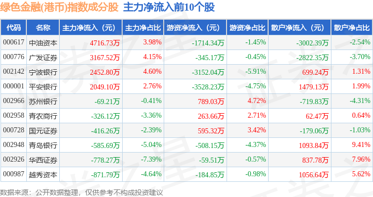 资金流向方面,绿色金融(港币)(980053)指数成份股当日主力资金净流出合计4.94亿元,游资资金净流入合计1.58亿元,散户资金净流入合计3.36亿元。成份股资金流向详情见下表: