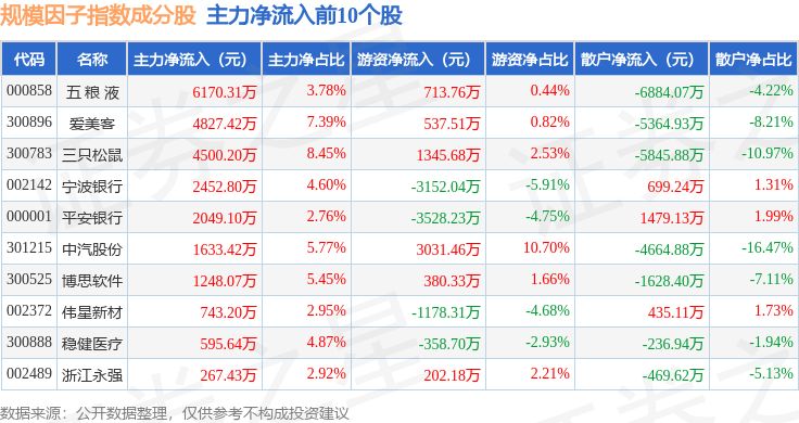 资金流向方面,规模因子(980055)指数成份股当日主力资金净流出合计8.24亿元,游资资金净流入合计2.14亿元,散户资金净流入合计6.1亿元。成份股资金流向详情见下表: