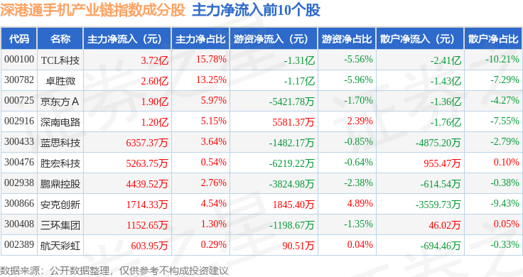 资金流向方面,深港通手机产业链(983009)指数成份股当日主力资金净流出合计25.53亿元,游资资金净流出合计1643.72万元,散户资金净流入合计25.69亿元。成份股资金流向详情见下表: