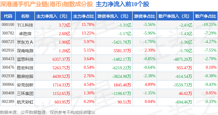 资金流向方面,深港通手机产业链(港币)(983010)指数成份股当日主力资金净流出合计25.53亿元,游资资金净流出合计1643.72万元,散户资金净流入合计25.69亿元。成份股资金流向详情见下表: