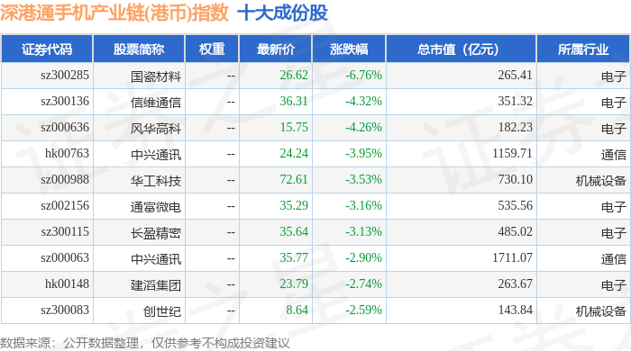 深港通手机产业链(港币)(983010)指数十大成份股详情如下: