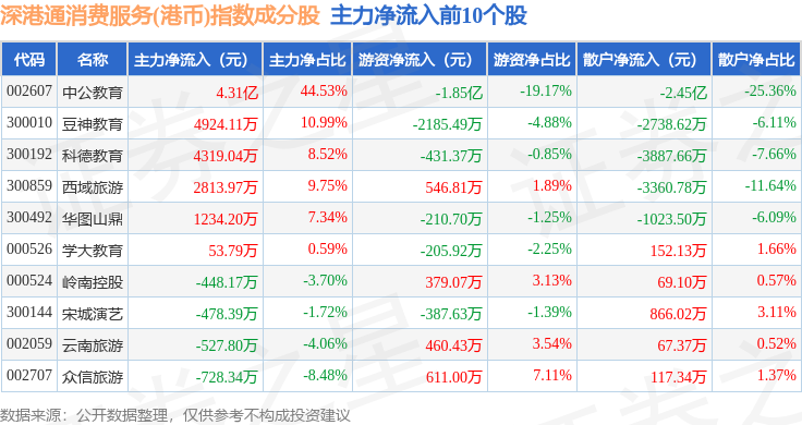 资金流向方面,深港通消费服务(港币)(983046)指数成份股当日主力资金净流入合计3.19亿元,游资资金净流出合计2.07亿元,散户资金净流出合计1.12亿元。成份股资金流向详情见下表: