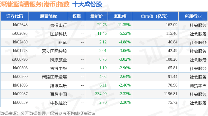 深港通消费服务(港币)(983046)指数十大成份股详情如下: