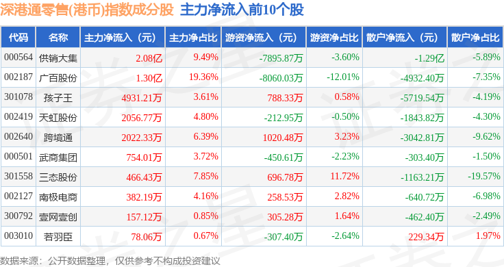 资金流向方面,深港通零售(港币)(983074)指数成份股当日主力资金净流入合计3.04亿元,游资资金净流出合计1.29亿元,散户资金净流出合计1.75亿元。成份股资金流向详情见下表: