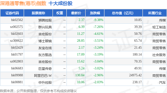 深港通零售(港币)(983074)指数十大成份股详情如下: