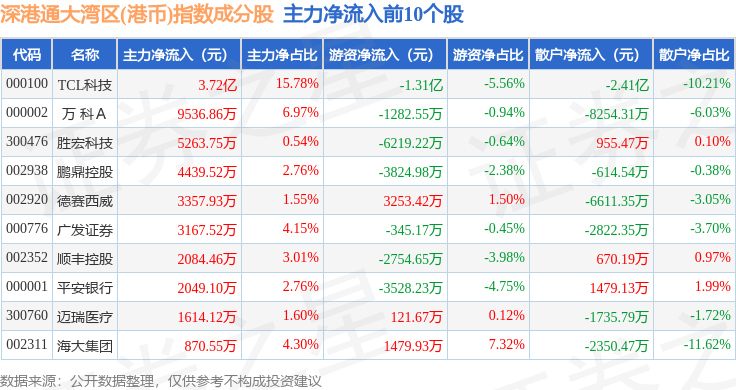 资金流向方面,深港通大湾区(港币)(983090)指数成份股当日主力资金净流出合计6.74亿元,游资资金净流出合计2.96亿元,散户资金净流入合计9.7亿元。成份股资金流向详情见下表: