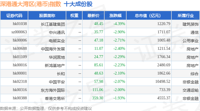 深港通大湾区(港币)(983090)指数十大成份股详情如下: