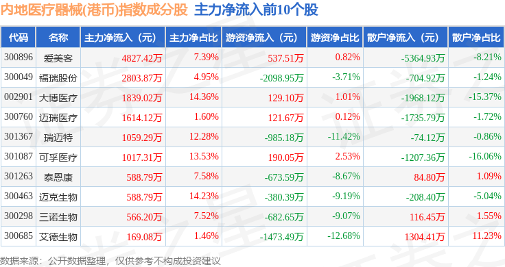 资金流向方面,内地医疗器械(港币)(983104)指数成份股当日主力资金净流出合计9011.45万元,游资资金净流出合计4113.75万元,散户资金净流入合计1.31亿元。成份股资金流向详情见下表:
