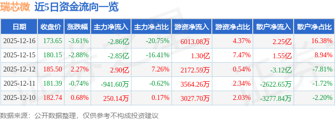 证券之星消息,截至2025年12月16日收盘,瑞芯微(603893)报收于173.65元,下跌3.61%,换手率1.86%,成交量7.84万手,成交额13.76亿元。