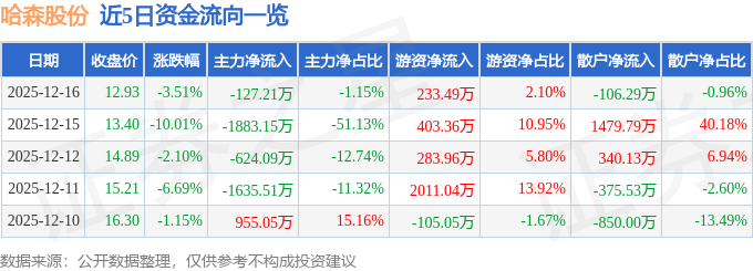 证券之星消息,截至2025年12月16日收盘,哈森股份(603958)报收于12.93元,下跌3.51%,换手率3.88%,成交量8.52万手,成交额1.11亿元。