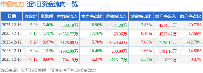 证券之星消息,截至2025年12月16日收盘,华银电力(600744)报收于5.96元,下跌3.4%,换手率1.79%,成交量36.32万手,成交额2.18亿元。
