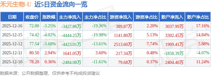 证券之星消息,截至2025年12月16日收盘,禾元生物(688765)报收于72.0元,下跌3.25%,换手率5.93%,成交量2.43万手,成交额1.77亿元。