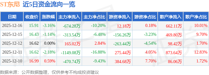 证券之星消息,截至2025年12月16日收盘,ST东尼(603595)报收于15.91元,下跌3.16%,换手率1.77%,成交量4.12万手,成交额6611.88万元。