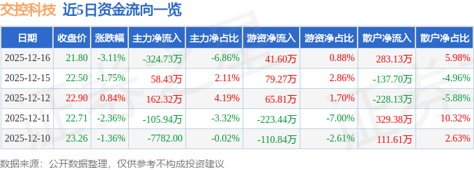 12月16日的资金流向数据方面,主力资金净流出324.73万元,占总成交额6.86%,游资资金净流入41.6万元,占总成交额0.88%,散户资金净流入283.13万元,占总成交额5.98%。