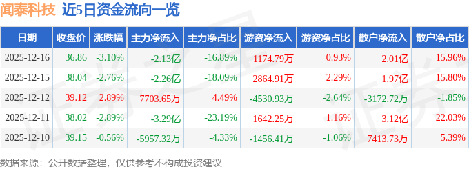 证券之星消息,截至2025年12月16日收盘,闻泰科技(600745)报收于36.86元,下跌3.1%,换手率2.73%,成交量33.98万手,成交额12.6亿元。