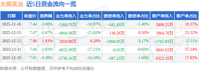 证券之星消息,截至2025年12月16日收盘,太极实业(600667)报收于7.44元,下跌3.0%,换手率2.02%,成交量42.25万手,成交额3.16亿元。