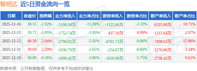证券之星消息,截至2025年12月16日收盘,智明达(688636)报收于38.55元,下跌2.92%,换手率5.25%,成交量8.8万手,成交额3.38亿元。