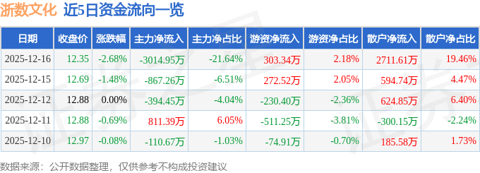 12月16日的资金流向数据方面,主力资金净流出3014.95万元,占总成交额21.64%,游资资金净流入303.34万元,占总成交额2.18%,散户资金净流入2711.61万元,占总成交额19.46%。