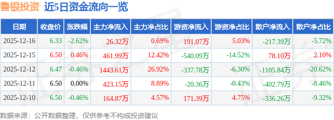 证券之星消息,截至2025年12月16日收盘,鲁银投资(600784)报收于6.33元,下跌2.62%,换手率0.88%,成交量5.93万手,成交额3798.41万元。