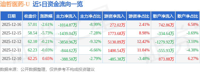 证券之星消息,截至2025年12月16日收盘,迪哲医药(688192)报收于57.01元,下跌2.61%,换手率0.43%,成交量1.97万手,成交额1.13亿元。